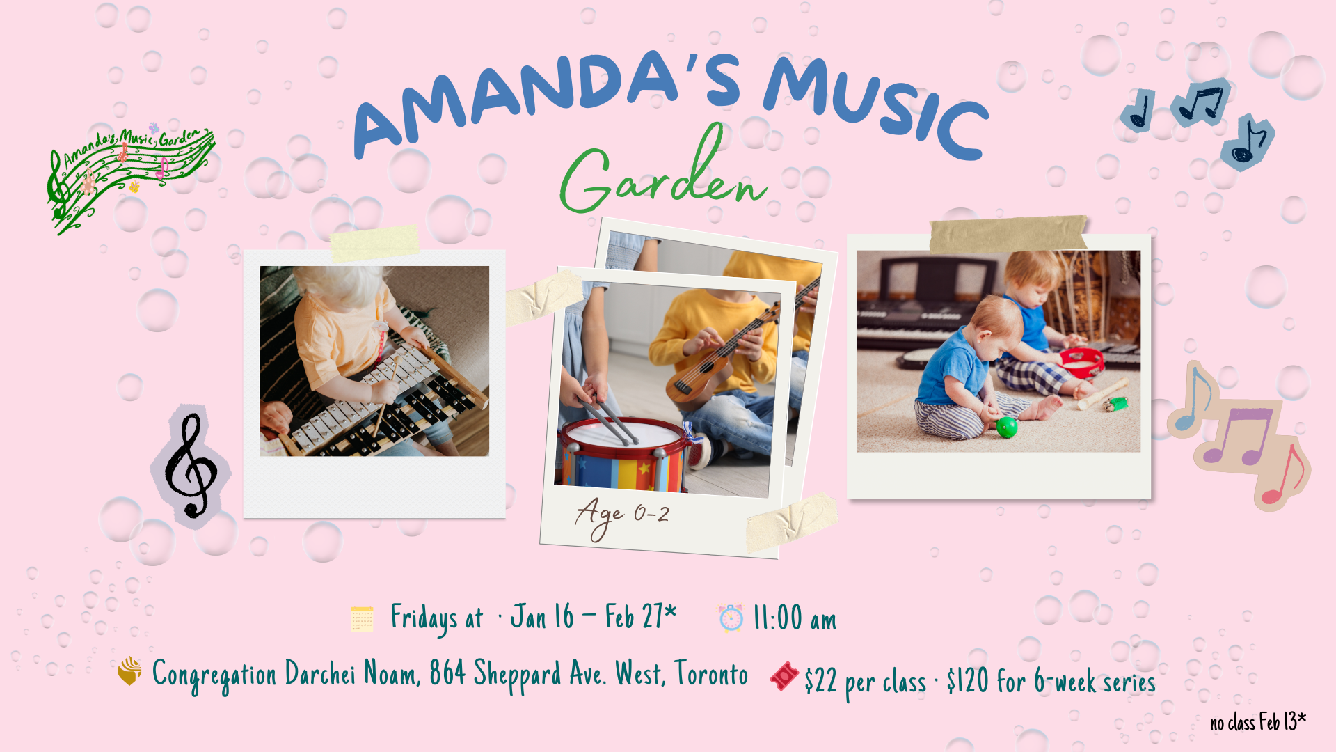 Amanda’s Music Garden blossoms at Darchei Noam—inviting parents and babies (under 2) to a joyful, 40-minute musical adventure every Friday at 11:00 am. What to Expect Watch little faces glow in a whirlwind of sound and color—bouncing balls, rattling shakers, swirling scarves, parachute play, twinkling lights, and bubbles galore. Shabbat themes flow through playful prayers and songs, set to nostalgic pop, Broadway, jazz, and Hebrew-infused favorites. Series Details Six Fridays: Jan 16, 23, 30; Feb 6, 20, 27 (no class Feb 13) $22 per class or $120 full series (save $12!)—siblings free All materials provided. Sing, dance, and welcome Shabbat with joy and connection. Register Here
